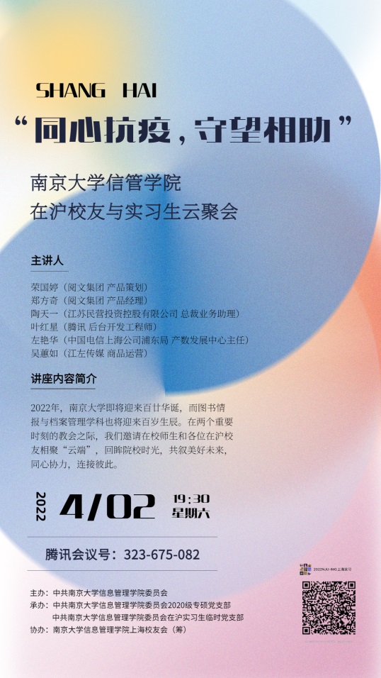 疫情防控在哪里,支部就建到哪里。在由学院党委主办,2020级专硕党支部和在沪实习生临时党支部承办,信管学院上海校友会(筹)协办的沪上云聚会活动中,学院党委书记姜迎春同志代表学院对全院师生表达了关心和问候,对疫情中的南大信管人提出殷切鼓励和期盼,带领与会师生校友对母校百廿校庆寄予了美好祝愿。“临时党支部还将在今后和未来一段时间持续发挥作用,通过线上集体学习、信息共享、情感分享、资源互助等方式,辐射党员及其他普通同学,将在校师生、在外地实习同学和校友紧密团结,彼此守护,共克时艰。”学院党委副书记罗萍同志做补充介绍。