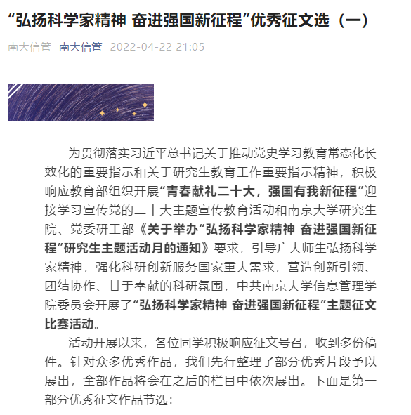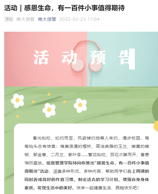 疫”路同行,“云上”活动活跃校园。学院党委调动各党团学生组织积极性,开展线上活动创意大赛及实践活动。鼓励实验室、课题组策划各类线上活动,学院奖励优秀创意并给予经费支持。而“弘扬科学家精神 奋进强国新征程”主题征文比赛渐入高潮,优秀作品正陆续在“南大信管”微信公众号推出。“阳光生活每一天”线上打卡活动近百人,“有一百件小事值得期待”鼓励同学们感受美好生活,树洞分享和投稿活动记录同学们的“悄悄话”。构筑同心战“疫”心理防线,以党团学生干部、班级心理委员为主要力量,学院精心组织心理情景剧创制工作,生动演绎了在校园疫情防控中辅导员师生经历角色互换后的相互理解和支持。那些看似被疫情“偷走”的青春,正因抗“疫”和奋斗焕发另一种光彩。