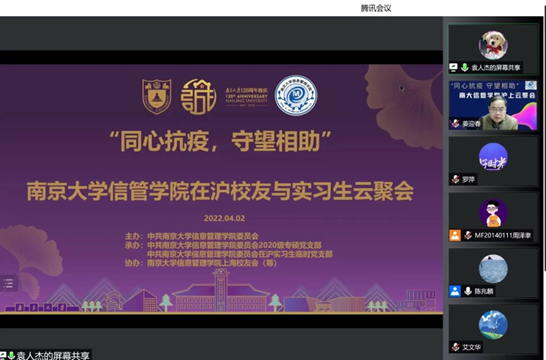 42日晚730分,信息管理学院在沪校友、实习生及在校师生迎来一场特别的云端聚会。120余名南大信管人通过线上分享和互动,打破地域限制,回首校园时光,交流职场经验,探讨合作前景,在新冠肺炎疫情防控形势严峻之际,彼此温暖守护,互相鼓劲加油。