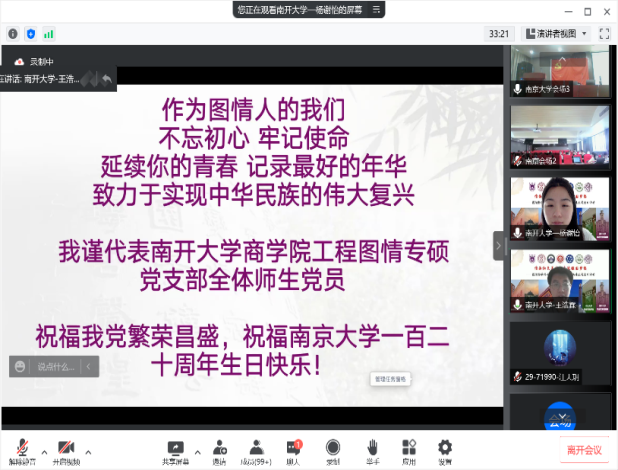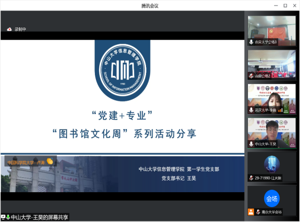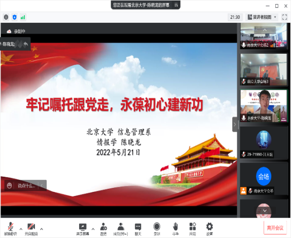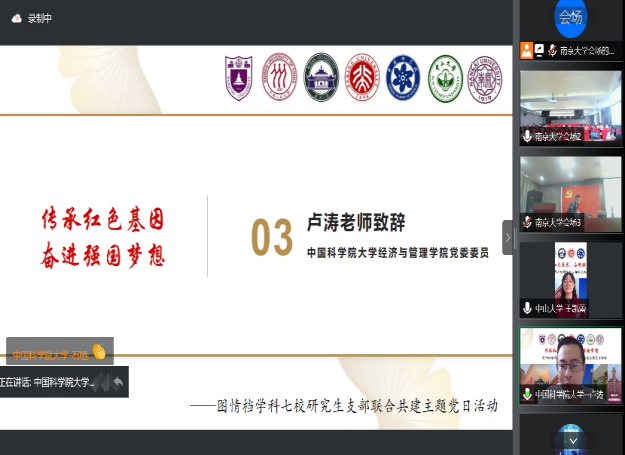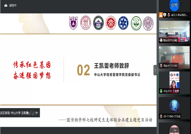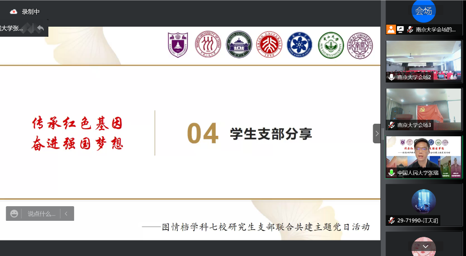 为深入学习贯彻习近平总书记4月25日在中国人民大学考察调研时重要讲话精神、学习总书记5月18日给南京大学留学归国青年学者的回信精神,南京大学信息管理学院2021级图书情报硕士第一党支部、中国人民大学信息资源管理学院2021级硕士2班3班联合党支部、北京大学信息管理系硕士生党支部、武汉大学信息管理学院情报学硕士研究生党支部、中山大学信息管理学院第一学生党支部、中国科学院大学经济与管理学院991党支部和南开大学商学院工程图情专硕党支部等图情档学科七校研究生党支部,于5月21日联合开展以“传承红色基因,奋进强国梦想”为主题的“云上”联学联建活动。来自全国天南海北的200余位青年学子,围绕图情档学科如何在弘扬留学报国传统、赓续红色血脉、坚定文化自信、讲好中国故事等方面发挥积极作用展开真诚而热烈的隔空对话。南京大学信息管理学院党委书记姜迎春老师、副书记罗萍老师,中山大学信息管理学院党委副书记王凯蕾老师,中国科学院大学经济与管理学院党委委员卢涛老师参与活动。