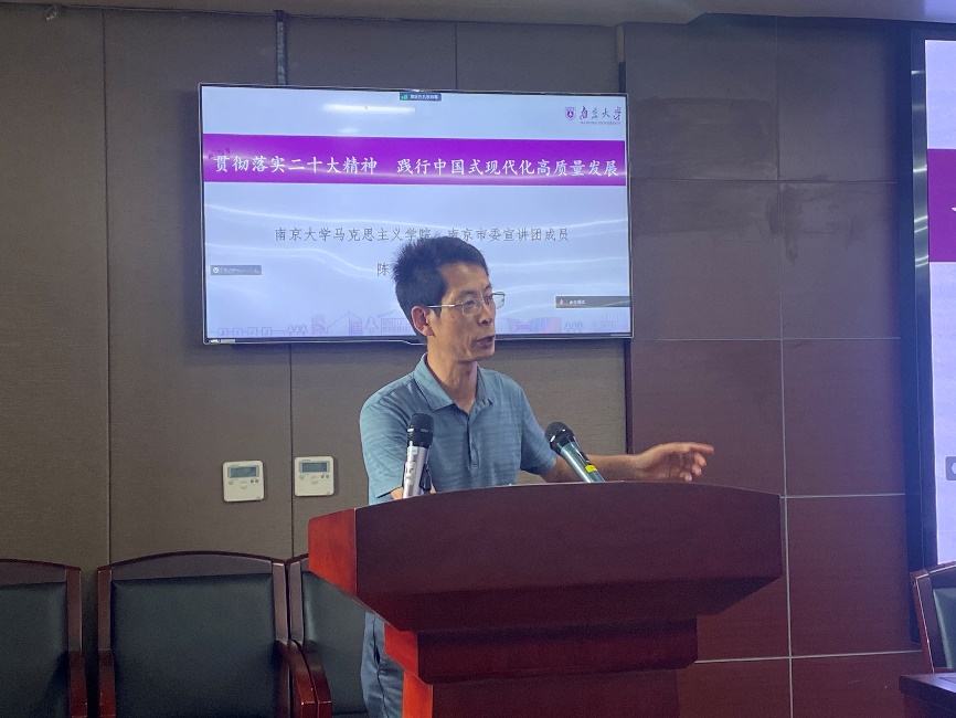 为深入学习贯彻习近平新时代中国特色社会主义思想和党的二十大精神,扎实推进学院分党校建设,613日下午,信息管理学院党委举办师生党员基本培训第一课,南京大学马克思主义学院副院长、南京市委宣讲团成员陈建以“贯彻落实二十大精神 践行中国式现代化高质量发展”为题作专题辅导报告。院党委书记马进军主持培训并作总结讲话。全院400多名师生党员参加培训。
