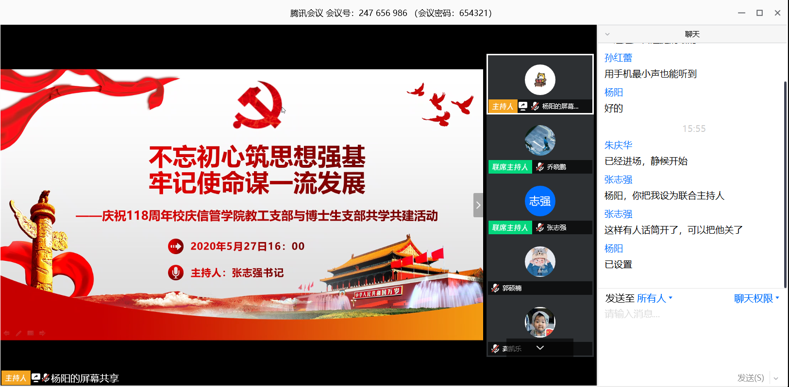 为庆祝南京大学118周年生日,增进师生交流,5月27日下午,信管院教工支部与博士生支部开展了以“不忘初心筑思想强基,牢记使命谋一流发展”为主题的共学共建活动。按照防控要求,此次活动以线上线下相结合的形式开展。学院党委书记姜迎春同志、院长孙建军同志带领部分党员师生代表在院楼211会议室,通过视频连线方式,与教工支部、博士生支部八十余名党员师生共同开展政治学习和业务研讨。党日活动由教工党支部书记张志强同志主持。