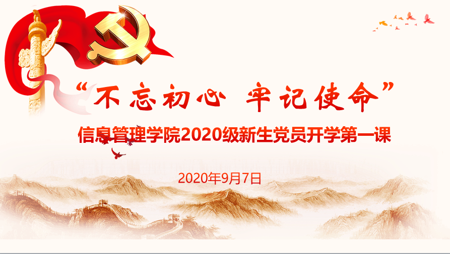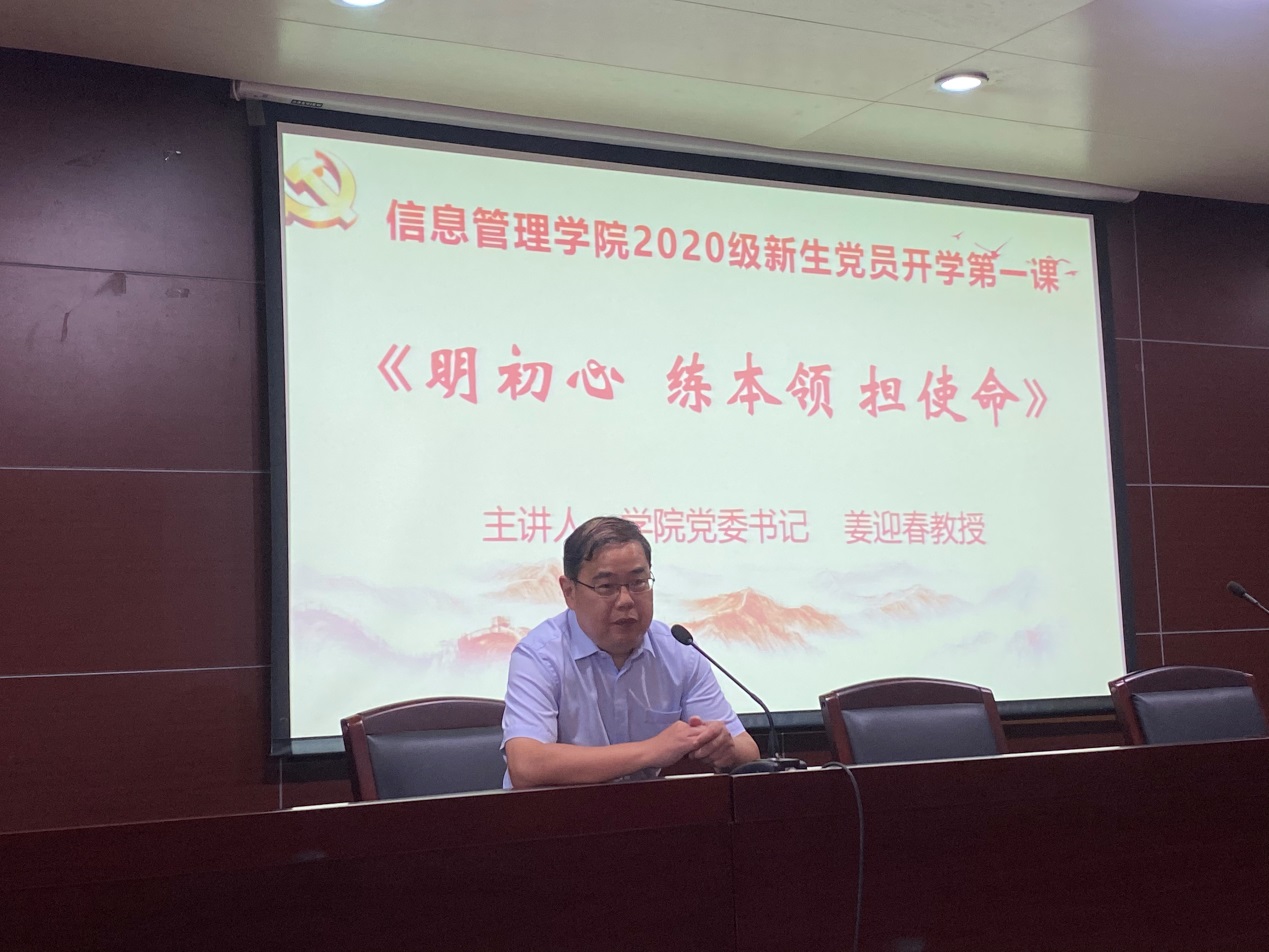 9月7日上午,信息管理学院党委以“不忘初心 牢记使命”为主题,举办“2020级研究生新生党员开学第一课”入学教育活动。学院党委书记姜迎春,党委秘书、专职组织员朱敏,团委书记李高杰,研究生新生党支部书记,与全体研究生新生党员共同参加学习活动。活动由学院团副书记李高杰主持。