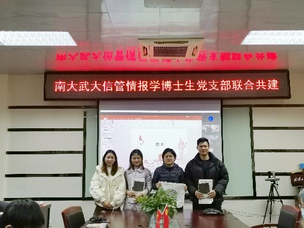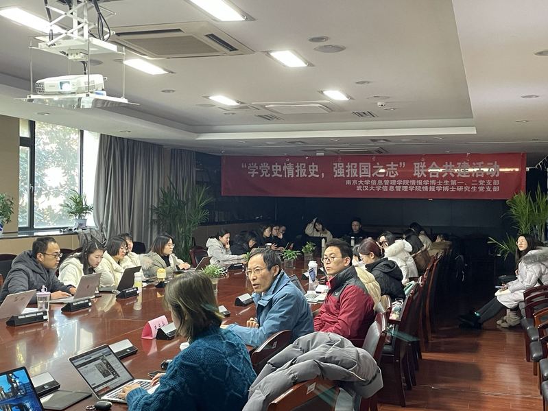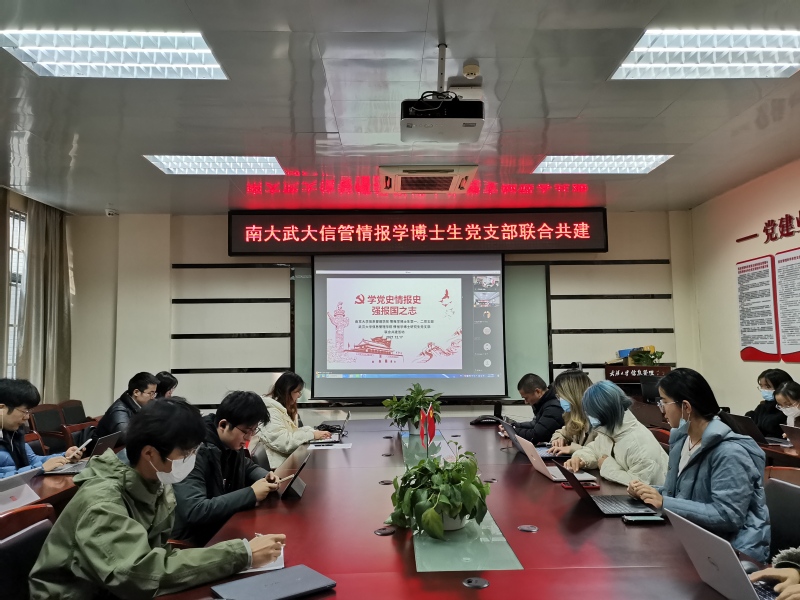 为加强情报学博士生党史学习教育工作,从情报学发展历史中汲取奋勇前行的智慧和力量,12月17日下午,南京大学信息管理学院情报学博士生第一、第二党支部联合武汉大学信息管理学院情报学博士研究生党支部举行共建活动。活动以线上线下相结合的方式展开,南大武大分设线下会场,活动主题为“学党史情报史,强报国之志”。南京大学信息管理学院副院长朱庆华教授,武汉大学信息管理学院陆泉教授,各支部党员以线上线下相结合的方式参会。与会师生将党史学习与情报史学习相结合,将党史教育与知识竞赛相融合,做到既丰富党史学习教育模式,亦促进院系间博士生专业交流。活动由南大信管情报学博士生第一党支部书记范涛、第二党支部书记孔嘉和武大信管情报学博士研究生党支部书记吴乐艳同志主持。
