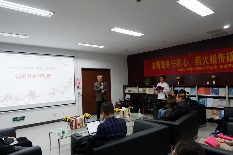 回望奋斗征程,传承红色基因,坚守入党初心,践行为民宗旨。12月23日下午,南京大学机关党委校办法制办党支部、信息管理学院党委“浓情暖冬守初心,薪火相传砥砺行”联合主题党日活动在信管学院红色经典悦读角举行。南京大学校长办公室、法制办公室主任杭祝洪,信管学院党委书记姜迎春及双方师生代表40余人参加活动。