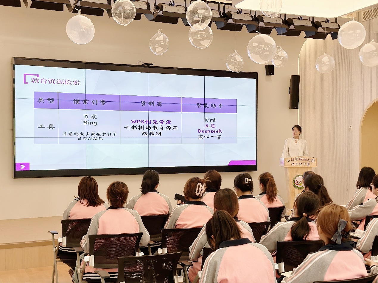 活动开场,主讲人刘枫荷带来“AI 赋能教案设计与课件优化”的专题分享。详细介绍了如何利用 AI 检索教育资源平台、并生成教案和 PPT。同时深入分析 AI 生成工具的优缺点以及课件优化的实用技巧。结合 AI 工具,教师们能够设计出更贴合幼儿认知水平、逻辑清晰且富有趣味性的教学方案。
