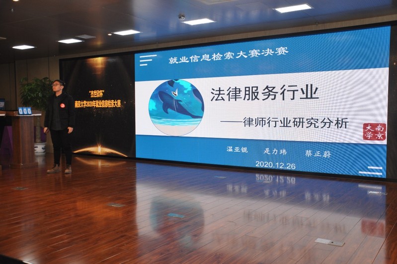 12月26日,“杰世欣杯”南京大学2020年就业信息检索大赛决赛在仙林校区众创空间路演大厅拉开帷幕。从初赛中脱颖而出的15名优秀选手,通过团队赛、个人赛两个环节角逐最后的奖项。比赛聚焦大学生职业生涯规划、就业政策、就业环境、求职技巧等信息素养能力提升,着力考察参赛选手的就业信息检索、组织与分析能力,展现了南大青年学子的理想追求和实践能力。校党委学生工作部王曦曦老师,校学生就业指导中心操琳琳老师、信管学院潘雪莲老师和刘千里老师担任比赛评委。