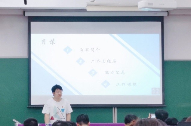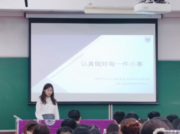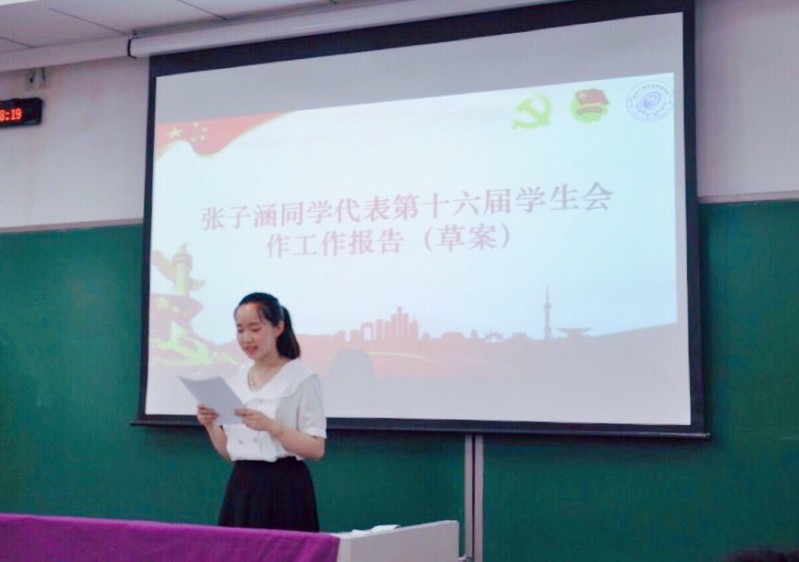 信息管理学院学生会主席张子涵同学代表第十六届学生会作题为《以人为本,做需求为先的服务者;凝心聚力,做温暖高效的同行人》的工作报告。