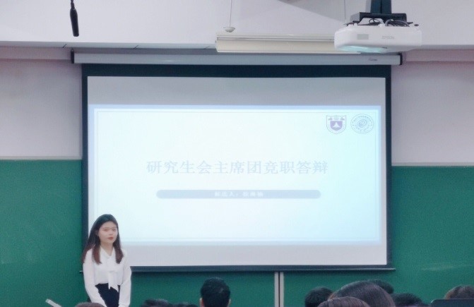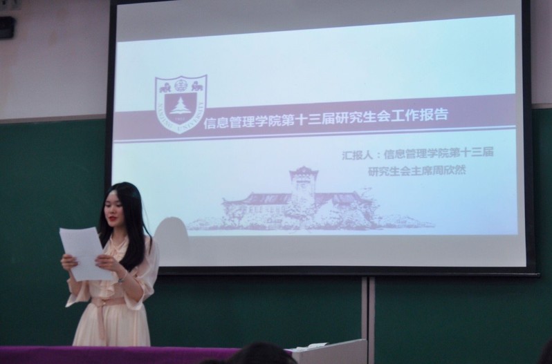 信息管理学院研究生会主席周欣然同学代表第十三届研究生会作工作报告。