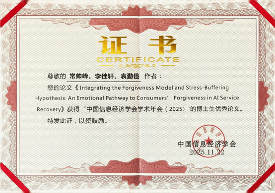我院2024级博士研究生常帅峰、李佳轩(导师:袁勤俭教授)提交的论文《Integrating the Forgiveness Model and Stress-Buffering Hypothesis: An Emotional Pathway to Consumers’ Forgiveness in AI Service Recovery》凭借其在人工智能服务恢复、情绪机制建构与跨理论整合方面的研究成果,从众多高质量研究中脱颖而出,成功获评“中国信息经济学会学术年会(2025) ”博士生论坛优秀论文奖。