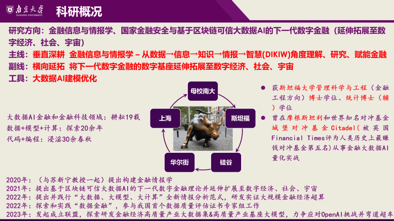 ●【技术应用和发明创造方面的探索】AI for Economics/Finance/SocialScience, Big Data for Economics/Finance/SocialScience, Blockchain for Economics/Finance/SocialSicence, 以及大数据AI与区块链融合创新应用等。当前聚焦大模型、AI4Science、AI4Science应用于金融经济和人文社科、DeFi、Web3、元宇宙、数据资产和数据金融、数智健康医疗等方面技术应用和发明创造(主线为“大数据、大模型、大计算”全新范式)。