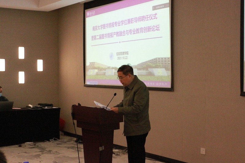 2021年10月22日,由南京大学信息管理学院主办的南京大学图书情报专业学位兼职导师聘任仪式暨第二届图书情报产教融合与专业教育创新论坛在南大国际会议中心举行。因疫情防控需要,本次大会采取线上线下相结合的方式举行,邀请了来自学界、业界的近十位专家学者以及60余位研究生,大家齐聚一堂,共同探讨学科建设与产业实践的融合发展,以期进一步完善图书情报专业学位师资队伍建设与实践基地建设,全面提升图书情报专业硕士人才培养质量。