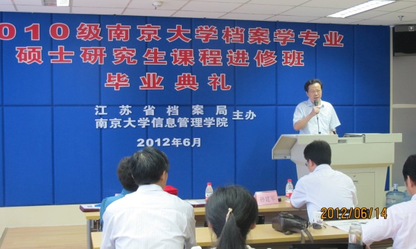 2012年6月15日上午,我校在逸夫管理科学楼举行由江苏省档案局委托、南京大学主办的2010级档案学专业研究生课程进修班毕业典礼。南京大学党委副书记朱庆葆、江苏省档案局副局长张姬雯以及有关领导出席了仪式。仪式由信息管理学院党委书记江莹主持。