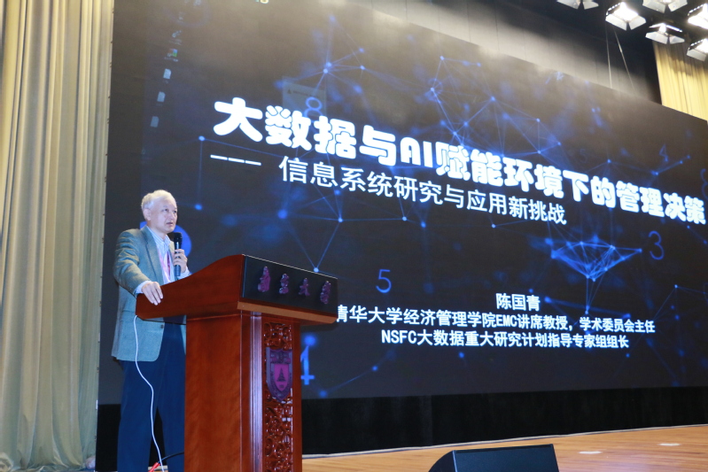 上午第一场演讲由中国人民大学王刊良教授主持。清华大学陈国青教授带来了关于大数据与AI 赋能环境下的管理决策的研究,从大数据时代特征出发,讨论了管理决策的时代变化以及相应的研究框架变化,最后对未来的信息技术与信息系统进行了展望。