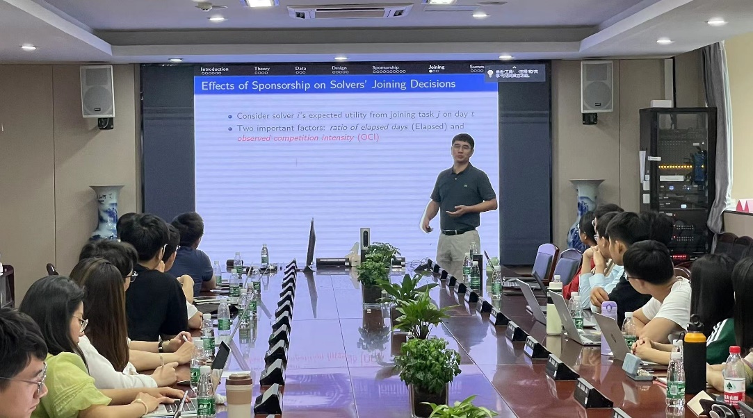 9月14日上午,陈建清教授继续为我院师生带来了题为“Sponsored Tasks and Solver Participation in Crowdsourcing Contests”的学术报告。讲座由朱庆华教授主持,吸引了我院教师、博士研究生、硕士研究生、本科生的积极参与。陈建清教授首先简要介绍了众包竞赛,并详细解释了研究过程和研究发现。他指出,与平台声称的赞助对参与的影响形成鲜明对比的是,赞助并不总是提高众包竞赛的参与度;只有当一个任务的奖金金额已经很高时,赞助才会增加参与者的数量。此外,即使参与者的数量增加了,但增加的主要是低能力的求解者。他们还发现,当赞助商增加提交的总数量时,它只能通过增加参与者的数量来实现。这项研究引起了师生的共鸣,激发了大家的思考,使大家受益匪浅。
