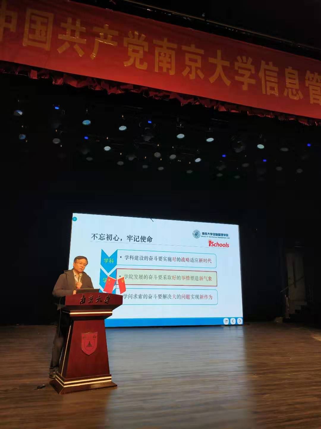 在“不忘初心 牢记使命”主题教育活动进程中,11月27日下午,信息管理学院党委在张心瑜剧场召开全体党员大会,由学院党委书记姜迎春同志和副书记、院长孙建军同志分别上党课。